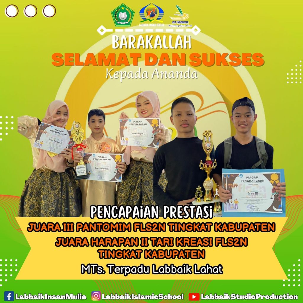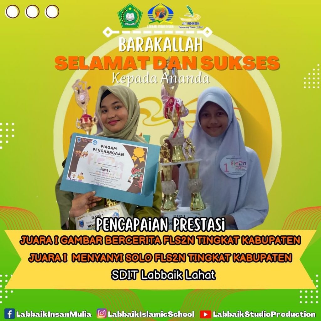 SIT Labbaik Lahat berhasil kembali menorehkan prestasi membanggakan dengan meraih Juara 1 Menyanyi Solo FLS2N Tingkat SD Se-Kabupaten, Juara 1 Lomba Gambar Bercerita FLS2N Tingkat SD Se-Kabupaten, Juara 3 Lomba Pantomim Tingkat SMP Se-Kabupaten, dan Juara Harapan 2 Lomba Tari Kreasi Tingkat SMP Se-Kabupaten.